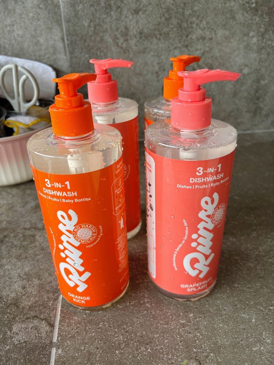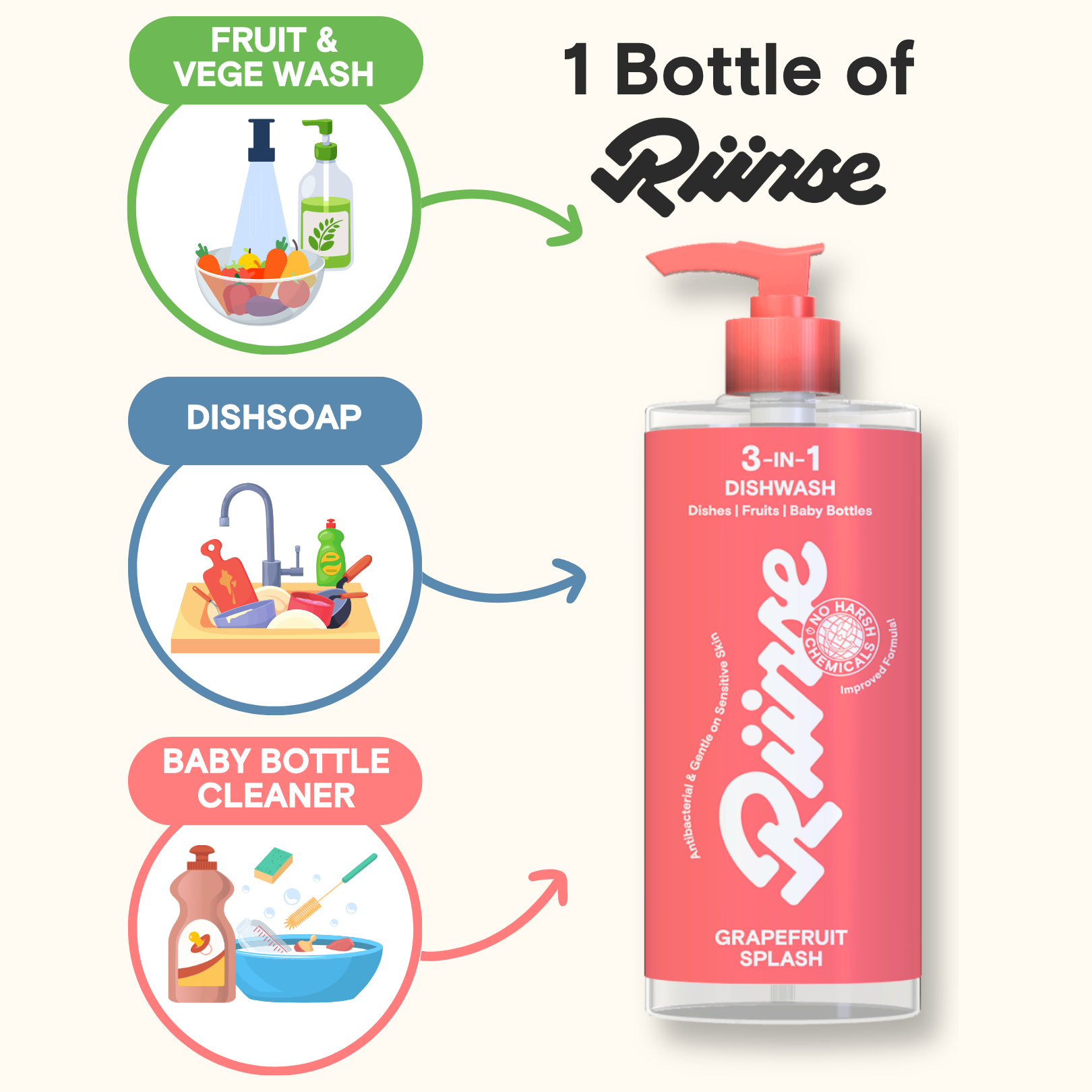 A powerful 3-in-1 Dishwash that cuts through grease while staying gentle on your hands - safe for dishes, veggies & fruits and baby bottles & accessories.