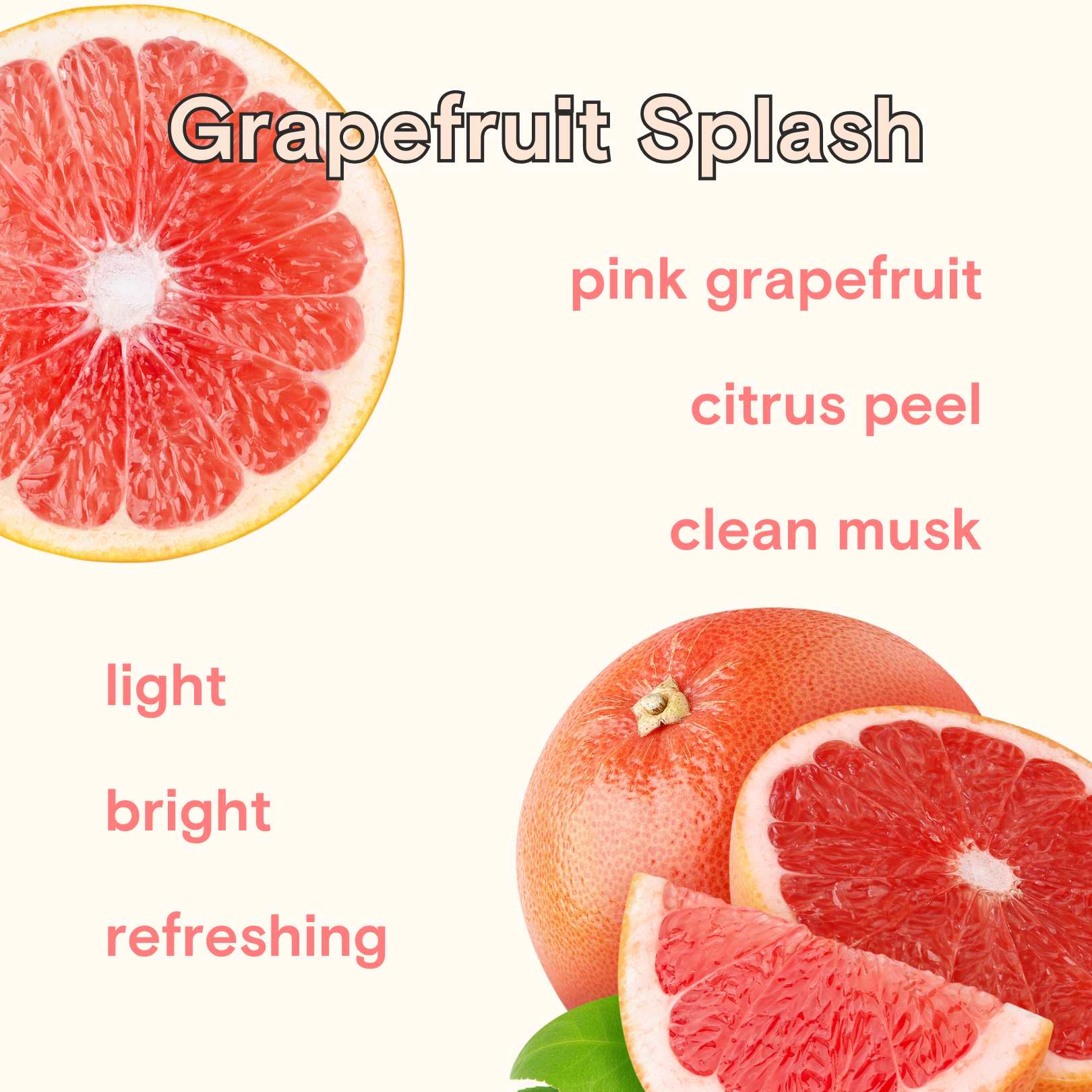 Water, Cocamidopropyl Betaine (Coconut derived cleaning agent), Lauryl Glucoside (Mild biodegradable cleaning agent), Aloe Vera Extract, Benzalkonium Chloride (Organic Salt disinfectant), PEG-120 Methyl Glucose Dioleate (Corn derived emulsifier), Citric Acid (pH balancer), Sodium Benzoate (Salt antimicrobial agent), Fragrance derived from Grapefruit & Orange